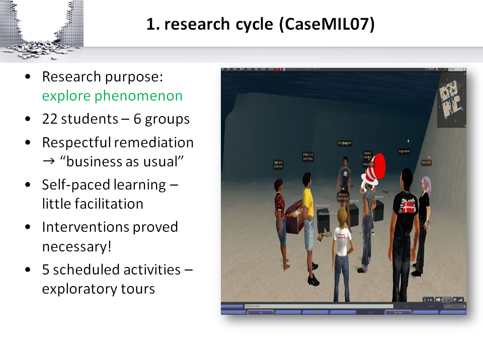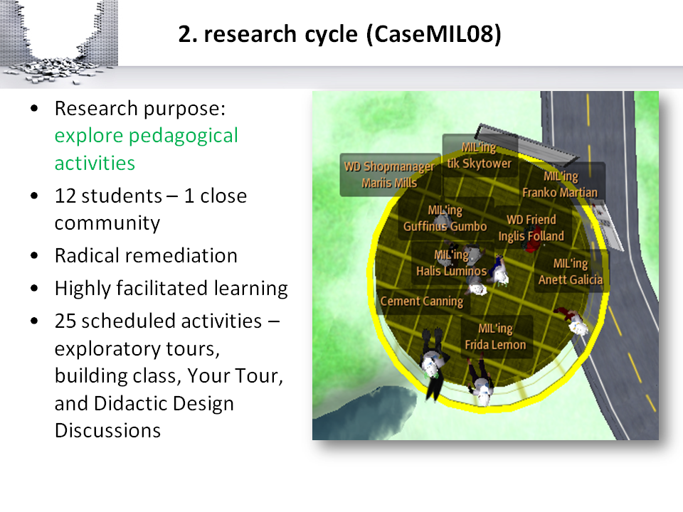 Regardless of the fact that I ran the first in-world course in the fall 2007 before I started on my PhD project (January ’08), that pilot course provided valuable data and I consider it to be the first research cycle.
