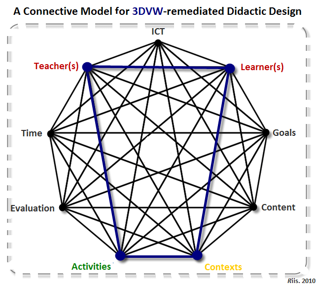 At the MIL education ICT is part of the curriculum and even though we also could do with more change, we do try to keep an eye on new media and their teaching and learning potentials. This was also the reason why my PhD-project became concerned with new augmented/immersive media in the shape of the 3D virtual world, Second Life (SL). Based on my experience with remediating existing practice into SL, this kind of medium clearly has the potential of changing the Didactic Design. Without having gone thoroughly through my data, I do see some changes regarding especially teacher(s), learner(s), contexts and activities. These four elements will be foci points in my analysis of SL and are highlighted in the model below:
