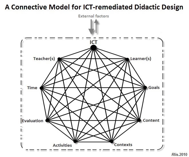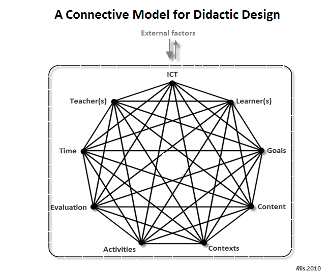 - Teacher(s) & Learner(s) – in Hiim & Hippe’s model people are absent at first glance. The Teacher is considered to be part of the setting and I guess that since the model is aimed at describing learning conditions and learning processes the student is somehow inherent. Based on my own teaching experience I, however consider the people involved in the Didactic Design to be the most influential element. This does not mean that I don’t consider the conditions (e.g. prerequisites) for teaching and learning to be important. On the contrary, but I think there is an acute need to focus on teachers’ conditions separately – especially when we combine Didactics with ICT.
