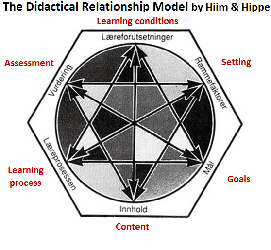 In line with Hiim & Hippe’s model, my model also portrays important didactic elements, but I have chosen to add a few more elements, substitute one and rename some of them. I also prefer to speak of connections instead of relations, while the latter to me implies some sort of personalized bond that I don’t see between all the elements that are interconnected. I suspect that the major reason as to why Hiim & Hippe’s model has gained such popularity has to do with the fact that the elements are quite generic and thus enable the user of the model to define sub-elements depending on own needs and purpose. One could argue that the elements I’ve added already are part of Hiim & Hippe’s model as sub-elements, but by highlighting them I believe greater emphasis can be obtained. While I do consider the elements in my model to be generic too and that my work with the model will refine the content/sub-elements, I do have some preliminary reflections.