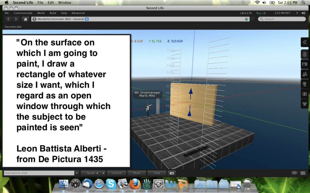 My head is spinning, Mariis. Wonderful post and such an interesting riff on Alberti and the concept of “windows”. I too have been completely taken by the power of the new SLSM function and what it hints at for the path ahead in education. To see (and interact with!) something recognizable/familar from the real world in the virtual world makes it so much more authentic – a huge qualitative lift. And when you add into the mix, the concept of multiple windows, nested windows, multiple images do we get hyperhypermediacy?