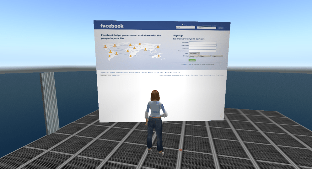 In short the SL Shared Media (SLSM) allows a wide range of web pages, including Flash and YouTube videos to be displayed on any surface of any prim (building block), among which some also allow for real time collaboration such as my student PerSecond and I previously demonstrated with Google docs and Etherpad. Now, in my context of Distance Education this new function offers many interesting possibilities. A major argument for me as a distance educator to research SL stems from this particular media’s ability to provide the user with a sense of being embodied in a palpable place – mainly in opposition to conventional teaching and learning platforms, where the user typically finds himself disembodied in impalpable space. In the pictures below I’m represented as my avatar standing on my holodeck looking at a shared media prim displaying Facebook.