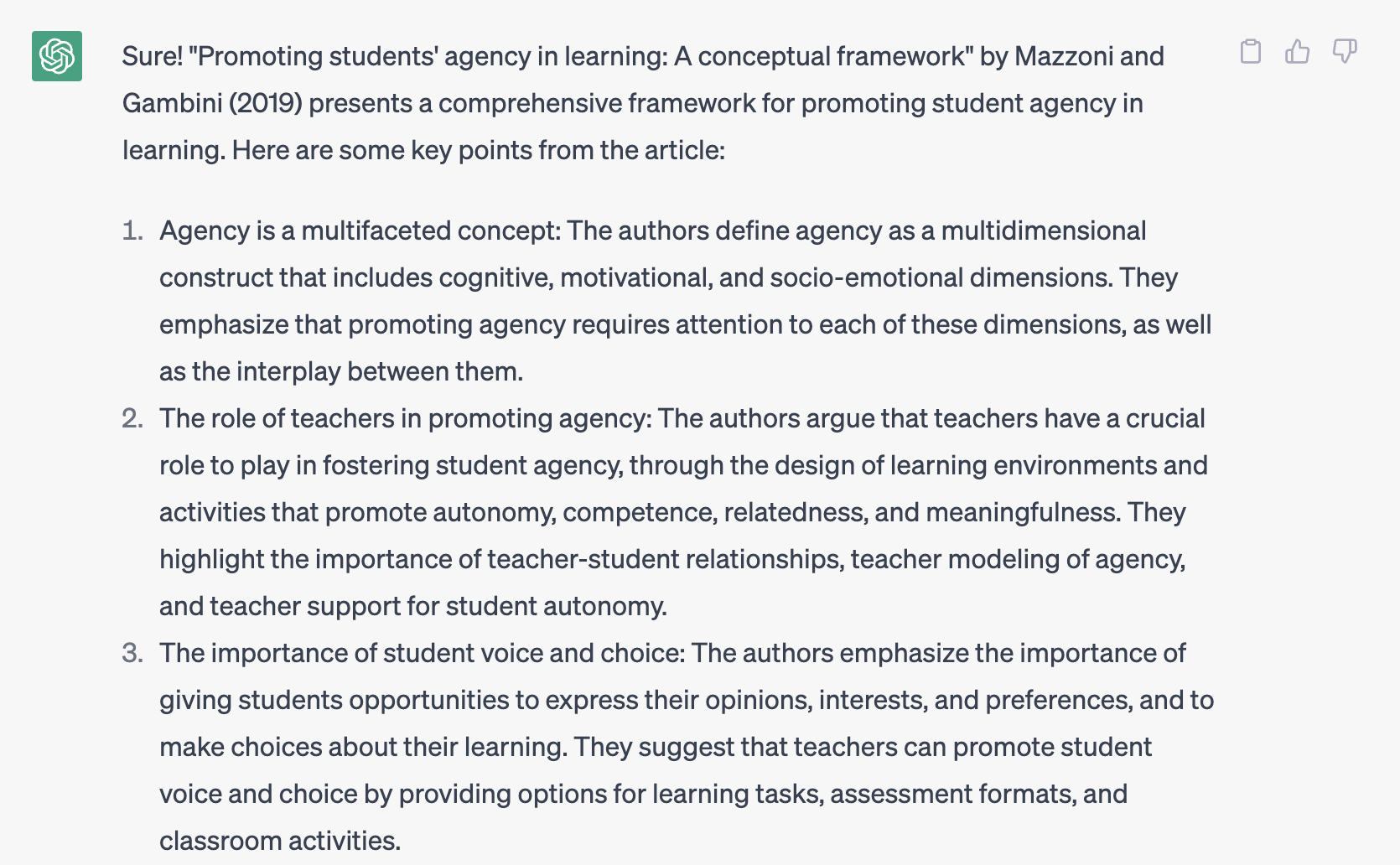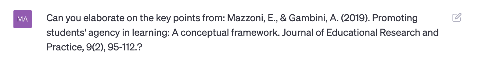 I forbindelse med skrivning af en artikel, bad jeg ChatGPT om inspiration til artikler om studerendes agency. Blandt de nævnte forslag, var der særligt en artikel, som fangede min interesse, og jeg bad derfor botten om følgende: