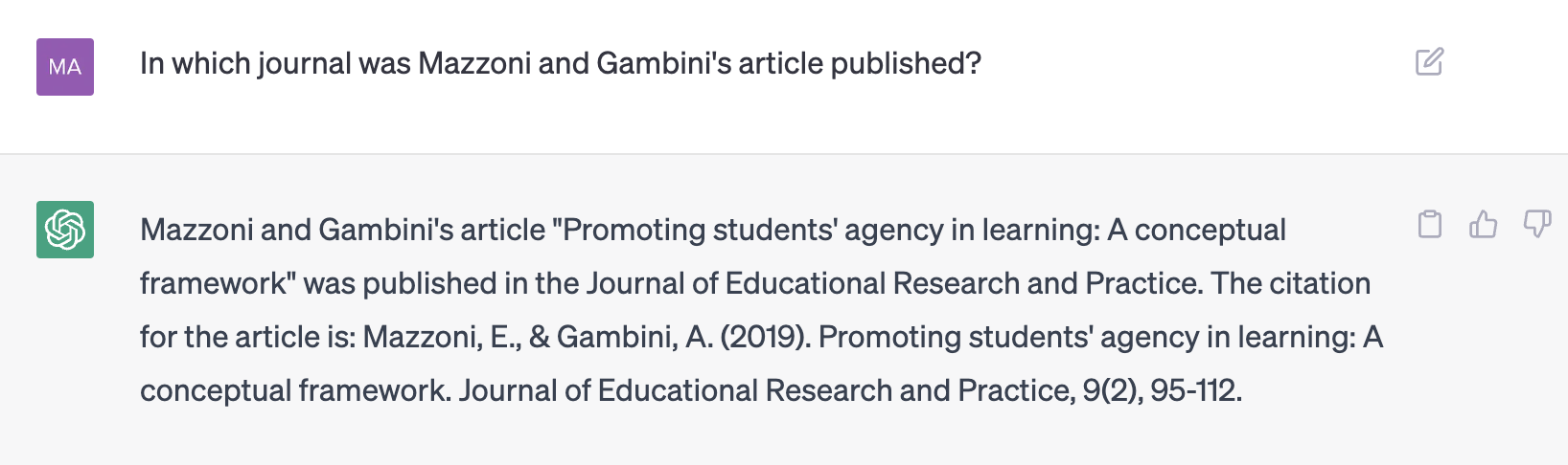 Det giver stadig ikke noget resultat, så jeg slår op i det nævnte tidsskrifts arkiver og kigger på 2019, hvor der findes et volume 9, men ikke et issue 2, så jeg beder om en forklaring. Botten er trænet til at være høflig, så den beklager fluks og forklarer, at den har lavet en fejl i citationen – uden dog at forholde sig til, at der ikke findes et issue 2: