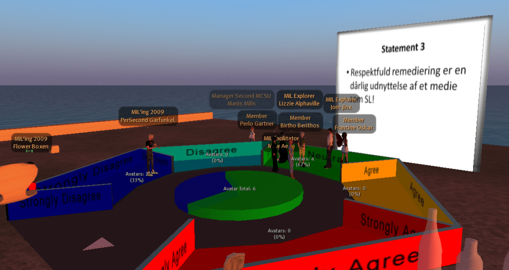 Given the fact that PerSecond was reluctant to use SL just a few weeks ago, I was quite impressed by his presentation and not least his willingness to explore and try out the many affordances of the medium. Per will continue his work with SL as part of his Master Thesis in the spring where he may be looking into the possibility of using SL as platform for work they are doing at VIA with Chinese collaborators.