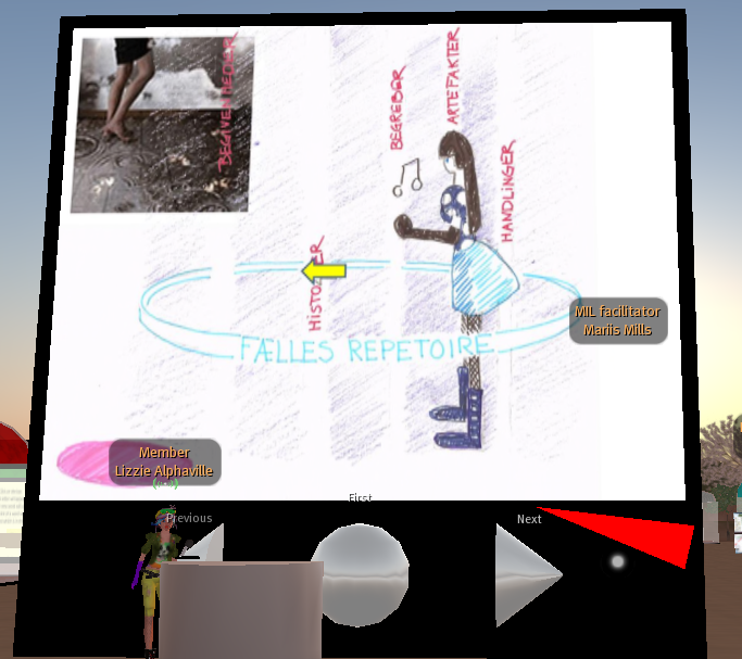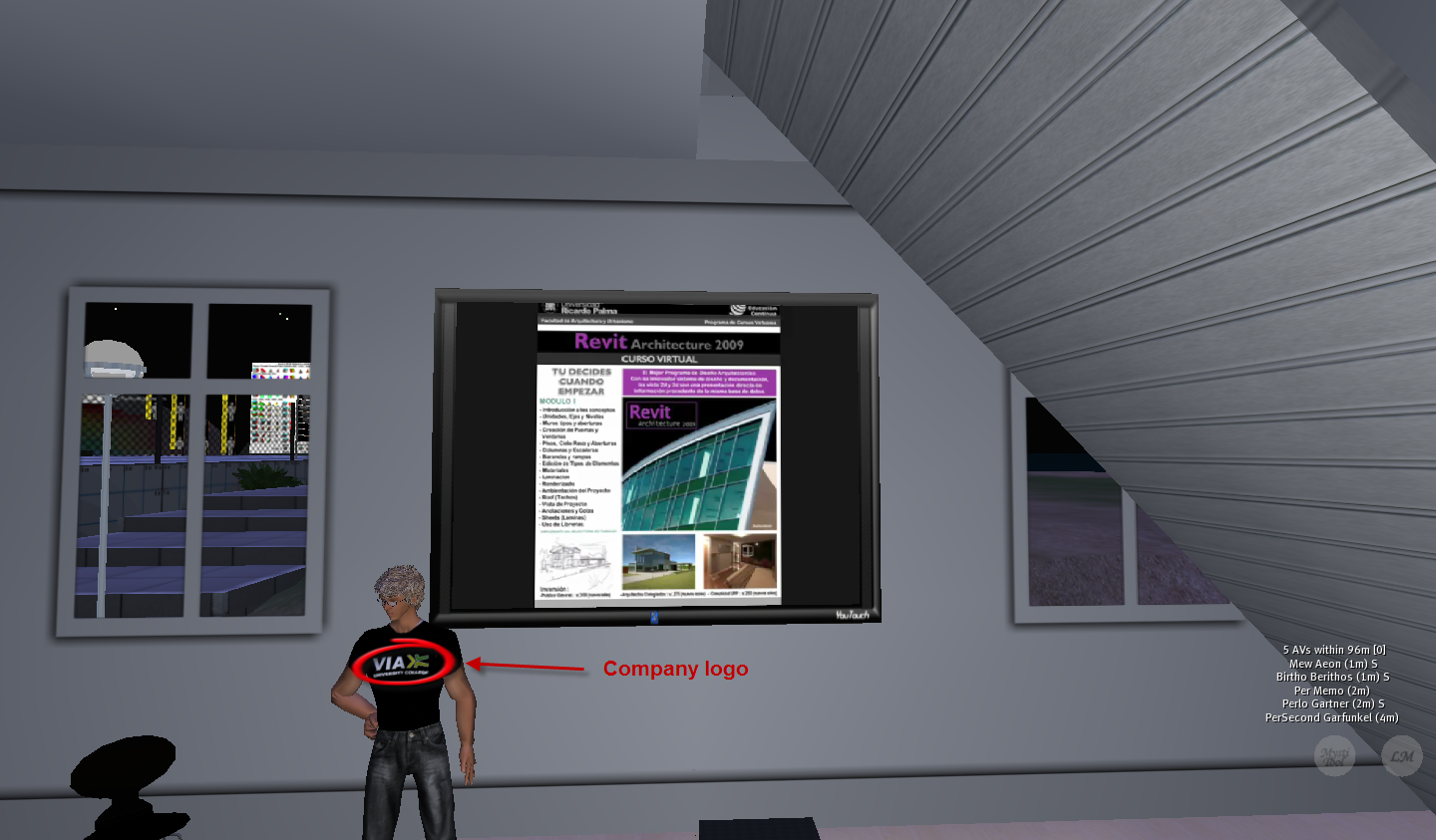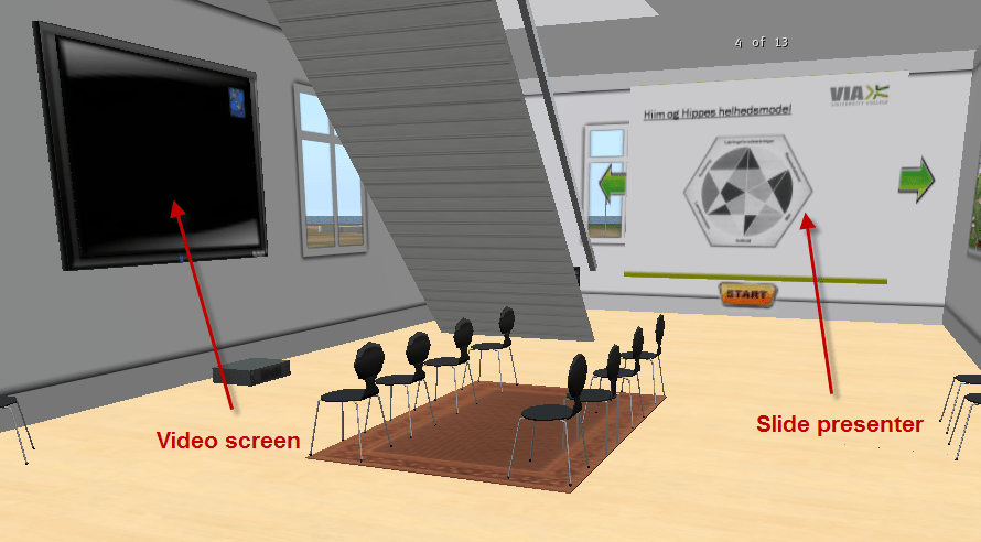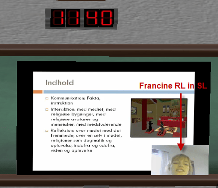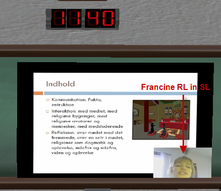 PerSecond was actually reluctant to change his appearance from the default look, when he first entered SL, because he didn’t want to put emphasis on that part, but as he learned that caring for your avatar’s appearance signals that you care for the world and are willing to make an effort to learn how to master the medium, he changed his mind. PerSecond told us that had recently received a t-shirt with his company logo, which enabled him to identify more with his otherwise estranged avatar, and as we shall see identity was part of the theme for PerSecond’s presentation. We then headed off to what turned out to be PerSecond’s own home on the Innovative Learning Island. RL PerSecond works at VIA University College that offers a combination of vocational, higher and further education and they’ve had a presence in SL for quite some time, but it wasn’t until PerSecond entered the MIL course and thus was forced to spend time in-world that he became convinced of the teaching and learning potential of virtual worlds. For his presentation PerSecond had prepared an interesting set-up with a video screen on one wall and a slide presenter on another – a challenging set-up if you don’t master the camera: