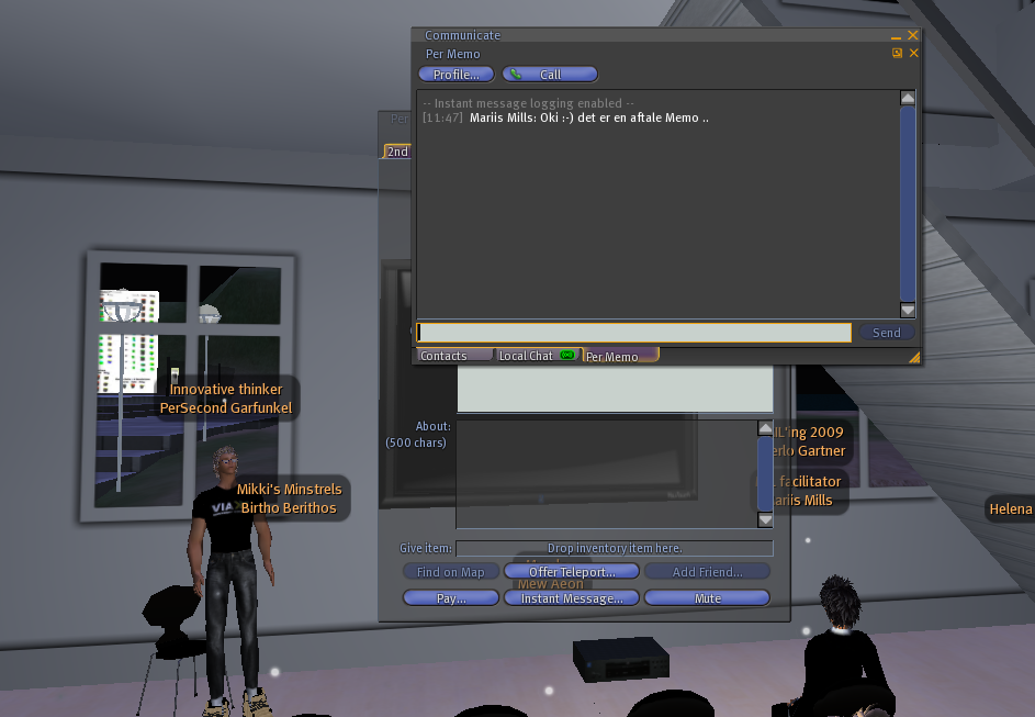 Using SL for work place training is obviously what appealed to PerSecond and he also envisioned different types of role play to enhance the professional identity of the students. There are already different outfits for the avatars to wear near the construction site, so that the students could enact different professional roles, but as another example of role playing PerSecond had prepared a little surprise for us in the shape of a second avatar, Per Memo. Per shifted between the two avatars and we were asked to comment on the presentation on IM with Memo.
