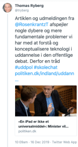 I kølvandet på ministerens udmelding bla. i Politiken, meldte Thomas Ryberg (AAU) sig på banen med en interessant tråd på Twitter. Her er Rybergs pointe bla., at vi skal være mere præcise, når vi taler om digitalisering – det kan være mange forskellige ting, og der er stor forskel på både muligheder og udfordringer forbundet med forskellige digitale teknologier.