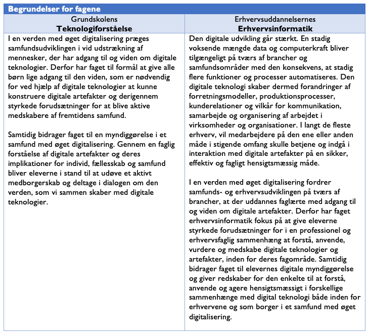 Relevansen for begge fag begrundes i den digitale udvikling, der præger vores liv – i grundskolen er fokus primært på livet som borgere, mens der i erhvervsuddannelserne henvises til det kommende arbejdsliv. Både i læseplanen og i vejledningen til fagbilaget er der mange passager, der understreger vigtigheden af fagene. Herunder ses et par illustrative udklip fra starten af dokumenterne: