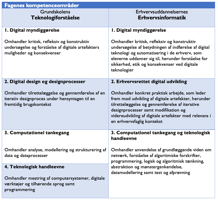 I ’Teknologiforståelse’ skal der arbejdes generelt med digitalt design og designprocesser, mens erhvervsuddannelsernes kompetenceområde igen er mere erhvervsrettet. I begge fag indgår kompetenceområderne computationel tankegang og teknologisk handleevne, dog er disse i ’Erhvervsinformatik’ samlet i et kompetenceområde**. En anden forskel er, at mens eleverne i grundskolen her skal fokusere på at analysere og mestre, er der for eleverne i erhvervsuddannelserne et tydeligere anvendelsesfokus. Endnu engang ser vi, at ’Erhvervsinformatik’ er væsentligt mere erhvervs- og arbejdsmarkedsorienteret.