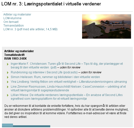 Rejseguide til Second Life I erkendelsen af at mange har en mening om virtuelle verdner og at kun få har faktiske erfaringer, indledes LOM #3 med Inger-Marie F. Christensens rejseguide ”Turen går til Second Life”. Artiklen er optaget uden for review. Formålet med denne artikel er at give et overblik over Second Life for at gøre det muligt for førstegangsbesøgende at orientere sig og planlægge meningsfulde besøg in-world. Artiklen er opdelt i to sektioner. I første sektion har forfatteren samlet en række praktiske oplysninger om bl.a. avatarfænomenet, installation af Second Life, tidsforskel, valuta samt kommunikationsformer og transport/navigation in-world. I anden del af artiklen har en række dedikerede og entusiastiske Second Life brugere bidraget med slurls til og en kort beskrivelse af deres favoritsteder. Der er noget for enhver smag.