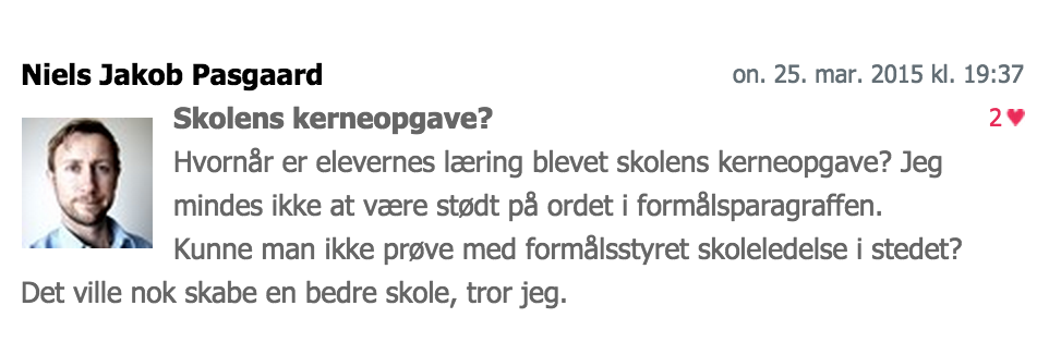 Nanna og Niels Jakobs diskussion udsprang af en anmeldelse i Folkeskolen.dk af bogen ”Læringscentreret skoleledelse” (Bjerg & Staunæs, 2015), hvor Niels Jakob kom med følgende kommentar: