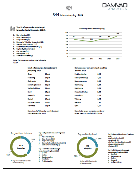 AI gør opmærksom på, at en sådan type jobopslagsanalyse er konfirmativ, men at den også kan bruges eksplorativt til at undersøge tendenser og at resultaterne efterfølgende kan bruges til målrettede surveyopfølgninger. Det fremgår også, at AI ser denne typer af redskaber som supplement til andre informationskilder (fx. aftagerpaneler, uddannelsesudvalg, dimittendundersøgelser mv.). AI nævner også en række af de begrænsninger, der kan være forbundet med datadrevet analyse, herunder at forskellige kompetenceord kan dække over samme kompetencer (hvilket understreger nødvendigheden af fortolkning), og at analysen kun inkluderer offentligt tilgængelige jobopslag (hvilket udfordrer datagrundlaget inden for områder, hvor rekruttering foregår gennem netværk og på andre uformelle måder). Desuagtet disse begrænsninger, kan jobopslagsanalyse give information om populære kompetencer, største aftagere, regionale forskelle mv. I rapporten gives flere eksempler på sådanne analyser, og herunder vises et eksempel på, hvilke informationer, der kan komme ud af en analyse af 344 jobopslag på laboranter: