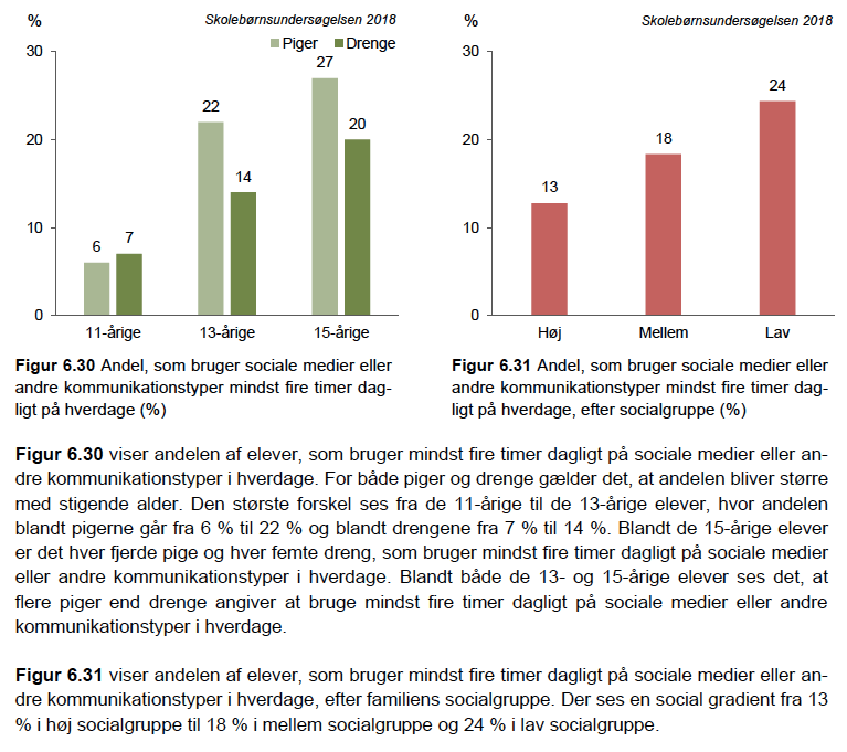 Næsten hver 3. pige og hver 5. dreng i 9. klasse er mindst 4 timer på sociale medier dagligt. Det er altså vældig meget for en ungdomsgeneration, der næsten har europarekord i fysisk inaktivitet. Og så viser alt for mange, især af pigerne, faretruende tegn på afhængighed, som vi alle skal være opmærksomme på, siger Mette Rasmussen fra Statens Institut for Folkesundhed. (Politiken, 11. april, 2019).
