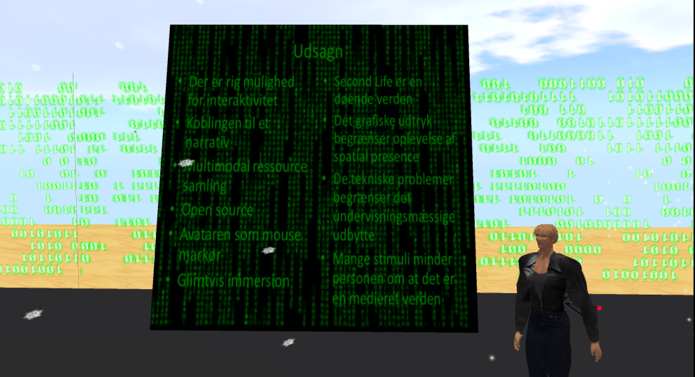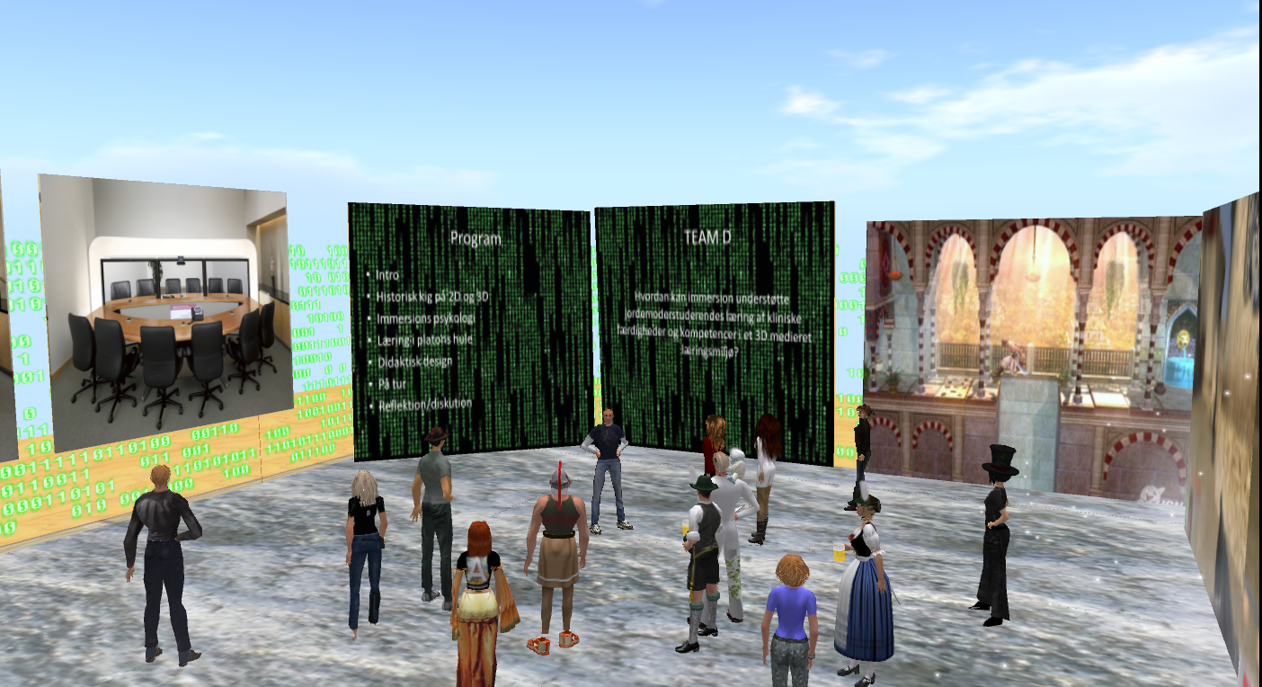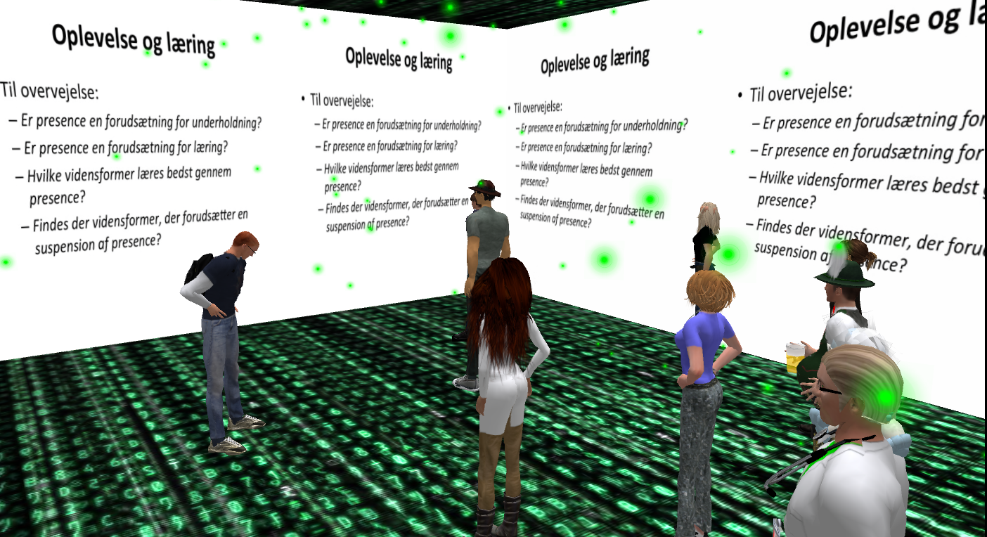 Again because of all the problems, I didn’t manage to document this part of the session in detail, but from the team’s manuscripts and the text-chat, I know that Team C, based on their investigation question, started to explain about some of their theoretical inspirations (Dewey and Dede), and they had some very thoughtful concerns regarding the target group’s possible acceptance of/and behavior in a medium such as SL.