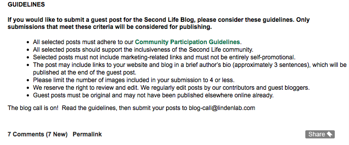 Basically, LL invites bloggers to submit original posts with “exposure” as only the only payment. This marketing approach isn’t unusual in the Web 2.0 economy, but it soon resulted in some vey negative tweets among some of the SL users I follow, and if you take a look at the comments, people were not impressed by this initiative. Lack of payment was, however not the only reason why some SL users reacted so strongly. The guidelines for submission (depicted below) also caused concerns, and I also think that the history between LL and its users had an important impact on the (negative) reactions.