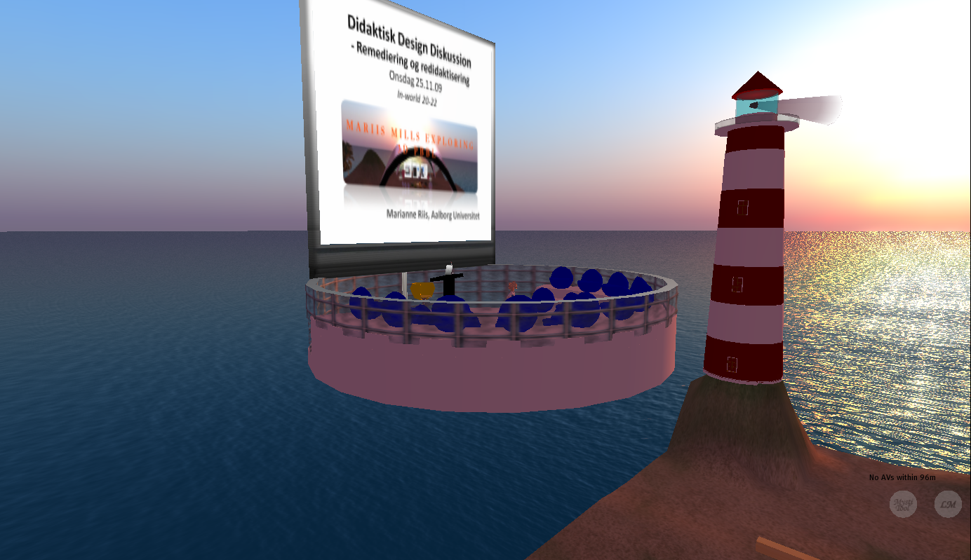 Since December 5th, 2011 I’ve been running a PD class with students from the Master’s Program on ICT & Learning (MIL) at Aalborg University, and in order to pass the course, the students were asked to do in-world team presentations on the teaching and learning potential of SL. On Wednesday January 25th, Team E had to do their presentation, and this is the final post describing the students’ presentations. Background information on the course/the presentation task can be found in the post describing the first presentation, and here are links to the second, third, and fourth presentations.