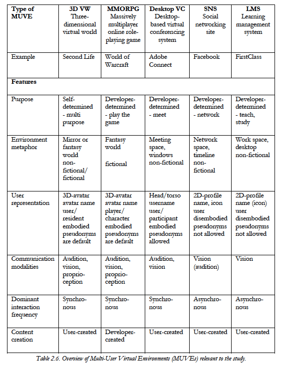 I min phd udarbejdede jeg nedenstående oversigt over de forskellige typer af Multi-User Virtual Environments (MUVEs), der var relevante for mit arbejde: