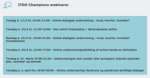 Synkrone webinarer kommer i mange forskellige udgaver, men her vil jeg for eksemplets skyld fremhæve de webinarer som Rikke Toft Nørgaard (AU) og en række nuværende og tidligere studerende fra uddannelsen It-didaktisk design gennemfører i øjeblikket. Jeg har ikke selv deltaget i nogle af disse webinarer, men jeg har deltaget i mange andre og typisk vil det være sådan, at der er en moderator el. koordinator, som har forberedt et emne og sat nogle rammer op, som det er tilfældet herunder: