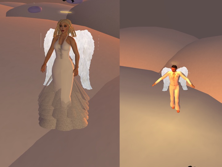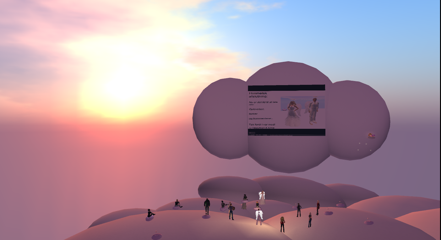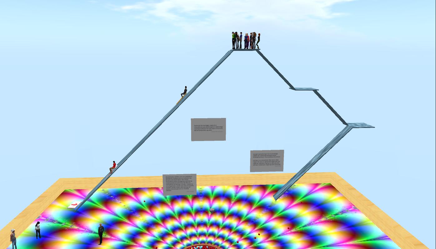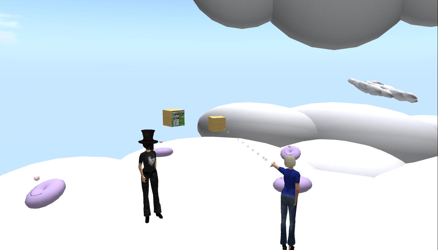 Back in the clouds, Happytown and Anina returned to their investigation question and elaborated on some of the theories (Wadley, The COI-model) they had used to support their work. Based on Nielsen’s work, Team E spoke of the necessity of the users’ ability to use their imaginative powers to feel immersed in an environment such as SL, and about the need to design for active knowledge construction via in-world artifacts.