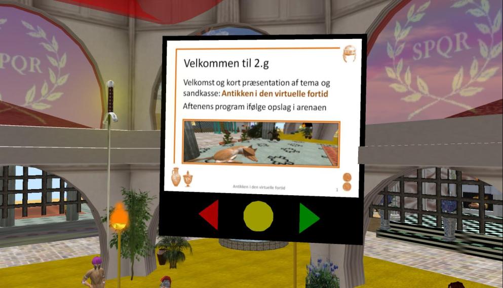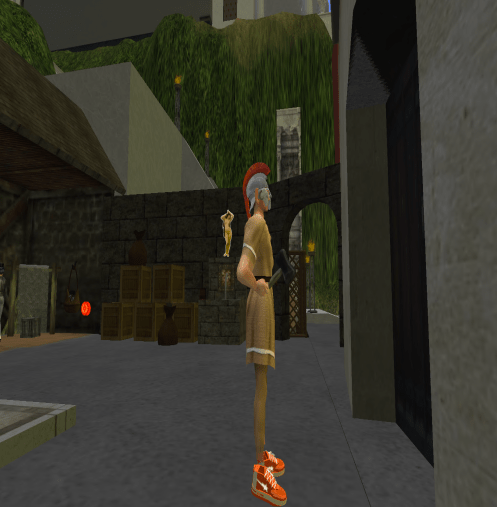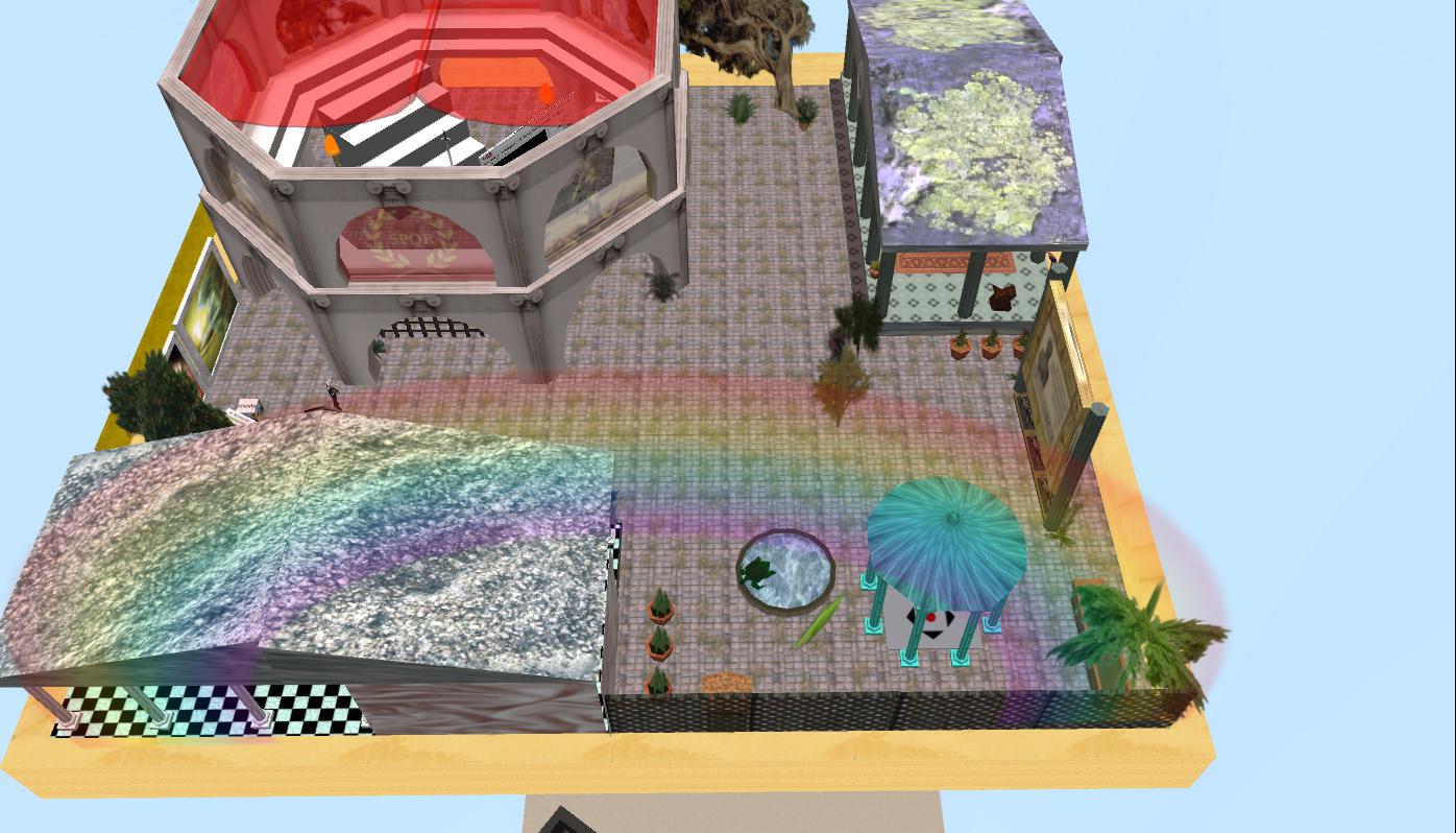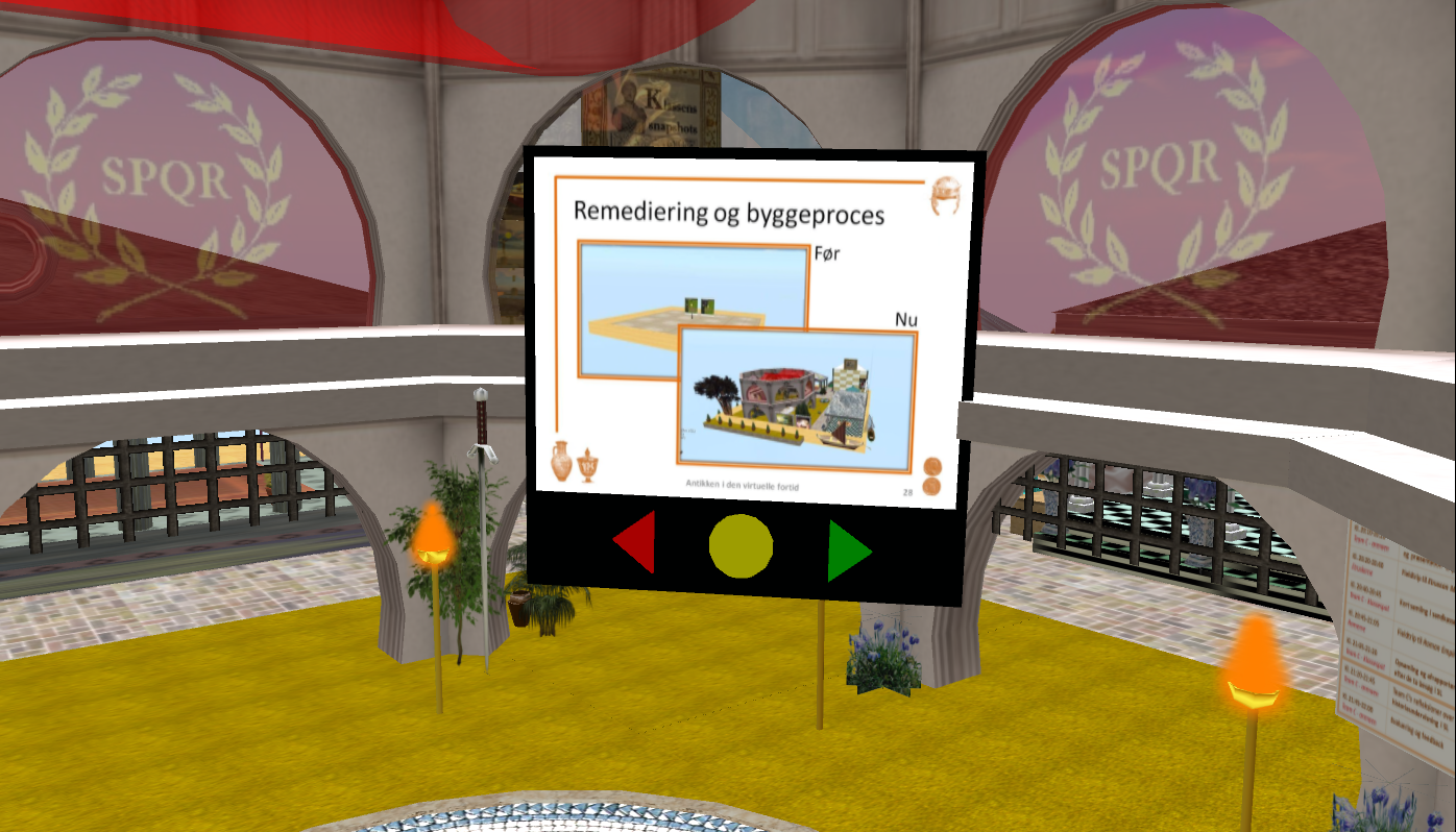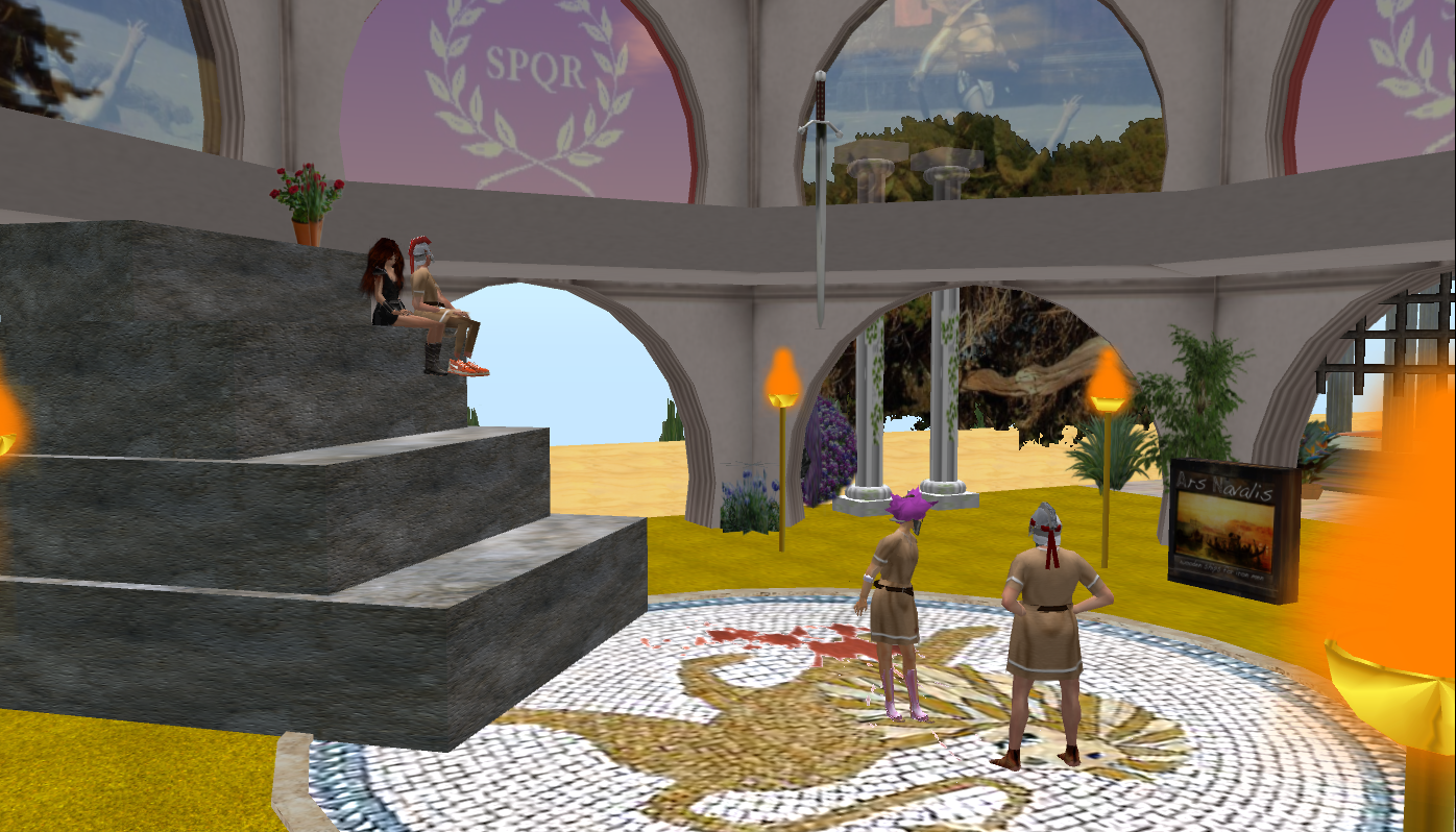 At approx. 8:40 PM, Team C asked us to go back to the team’s sandbox for further instructions for the next field trip. At this point, I began experiencing heavy lag, and several of the other participants also complained about various technical problems. Nonetheless, we headed off to the next destination; one of SL’s oldest historical rebuilds: ROMA (SPQR) . Arriving at ROMA, I could hardly move and I finally ended up stuck in a wall and decided to relog. Since that didn’t help, I went back to our class sandbox, and here I realized that my speak-button was no longer active. For the next 20 min. or so I tried shutting down my computer, reinstalling SL, I tried the Firestorm Viewer, and relogging – but nothing helped. Meanwhile, JoeChipmunk’s speak came back, but two other members of the team now had inactive speak-butons, as did several of the other participants.