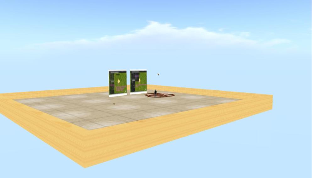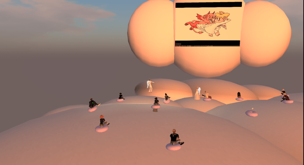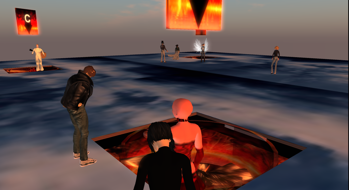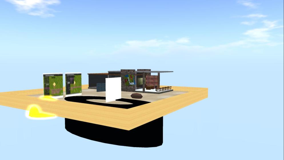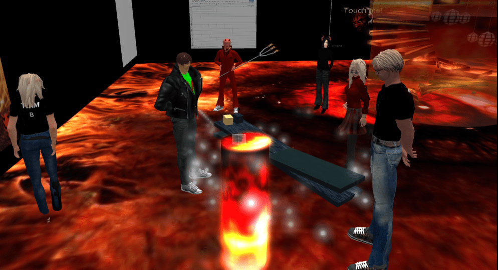 Team E made extensive use of the shared media feature throughout their presentation, and chose to show their slides on one of the clouds. The tricky issue with shared media is that each user sees the displayed media individually and so the start and stopping point of a video differs. However, Team E had sent out instruction prior to their presentation and after further elaboration in-world, everybody seemed to be on the same “slide”. The team explained how they had wanted to investigate Bolter & Grusin’s concept of remediation and use it to redesign some exercises from an existing instructional design from a Physics class.
