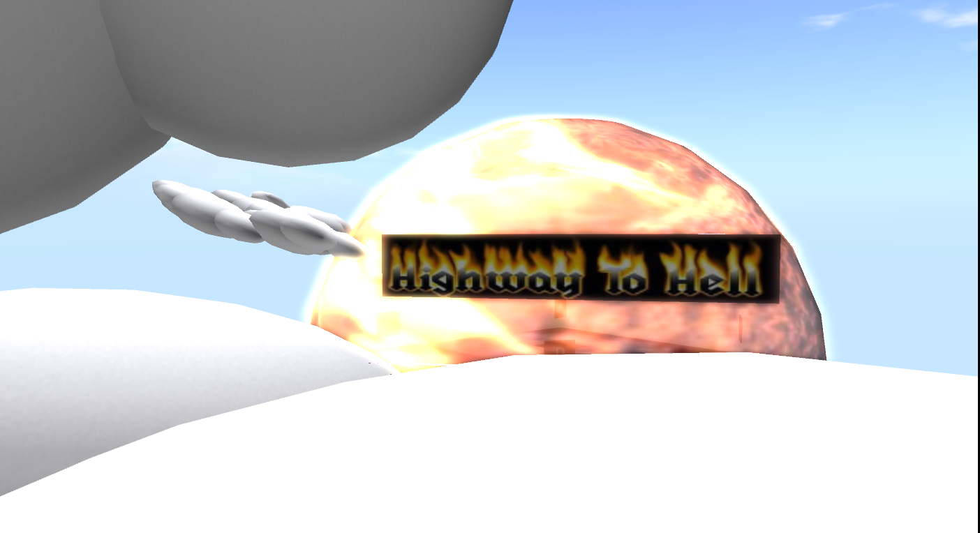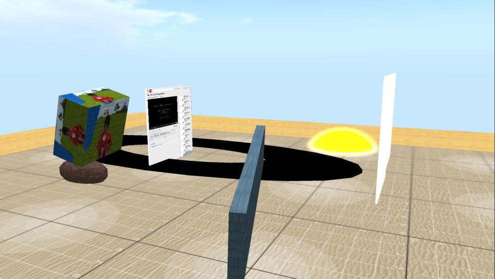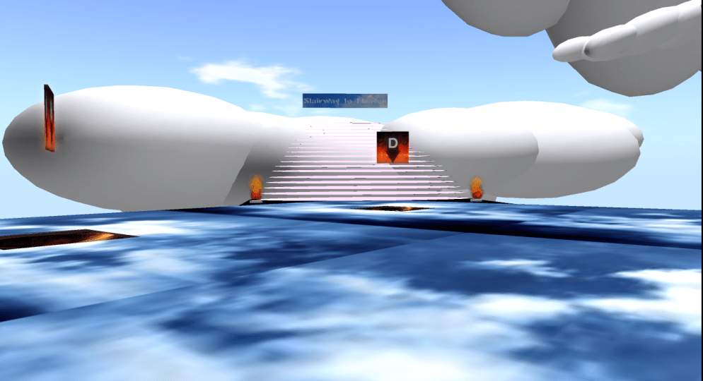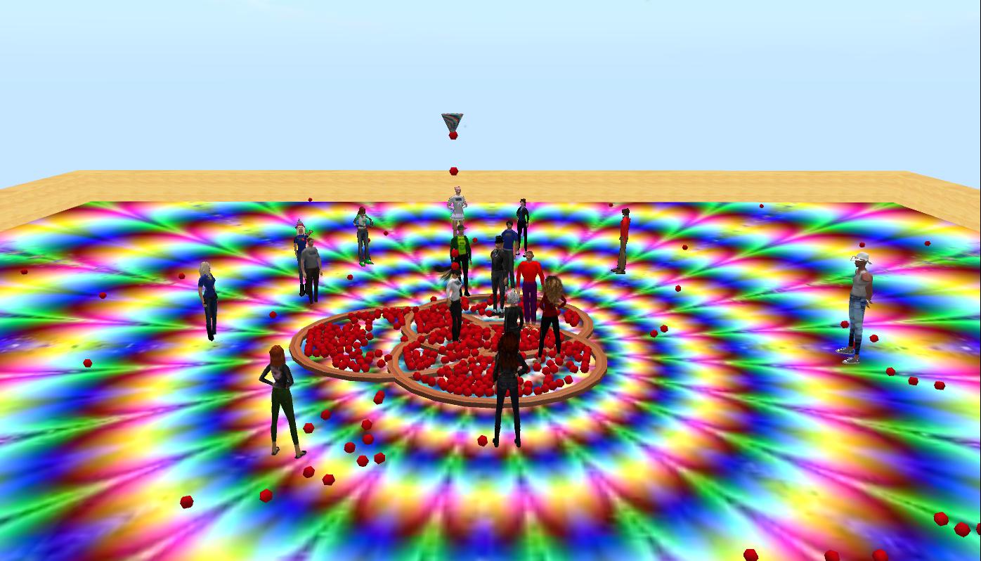 Team E made extensive use of the shared media feature throughout their presentation, and chose to show their slides on one of the clouds. The tricky issue with shared media is that each user sees the displayed media individually and so the start and stopping point of a video differs. However, Team E had sent out instruction prior to their presentation and after further elaboration in-world, everybody seemed to be on the same “slide”. The team explained how they had wanted to investigate Bolter & Grusin’s concept of remediation and use it to redesign some exercises from an existing instructional design from a Physics class.