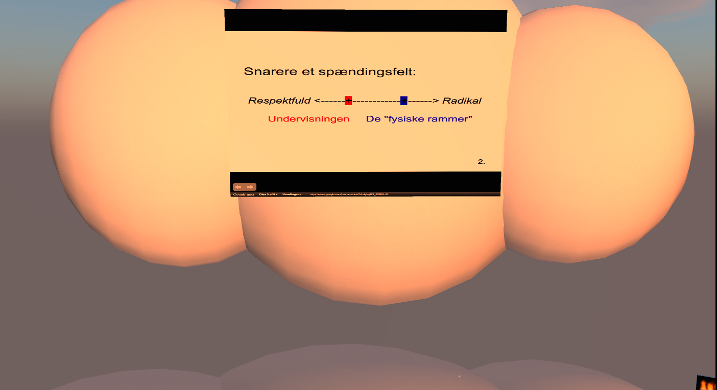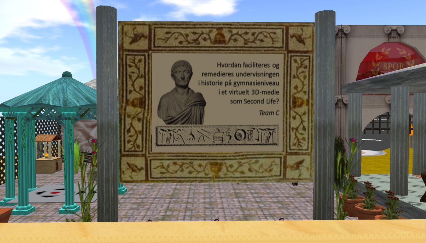 Again because of all the problems, I didn’t manage to document this part of the session in detail, but from the team’s manuscripts and the text-chat, I know that Team C, based on their investigation question, started to explain about some of their theoretical inspirations (Dewey and Dede), and they had some very thoughtful concerns regarding the target group’s possible acceptance of/and behavior in a medium such as SL.