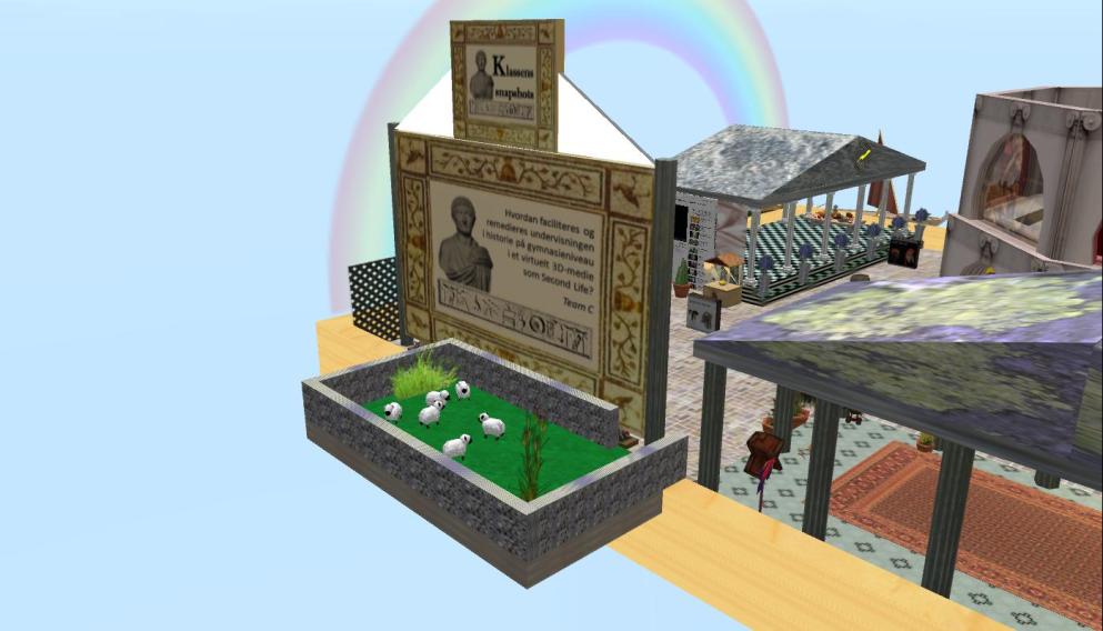 The team’s lead designer, JoeChipmunk had some interesting reflections on some of the challenges you face, when trying to replicate our past as the team had tried to do in the sandbox. The point of departure for the sandbox design had been a respectful remediation strategy, but with the target group in mind, the team had also decided to add “mystical” elements such as the rainbow, animated animals, air floating ships, and giant posters. JoeChipmunk also explained, how he had been forced to consider the authenticity of the different objects (e.g. did this kind of plant/animal exist at that point in time/in that part of the world), and in this sense, building in SL had sharpened his perception of history, validity of sources etc.
