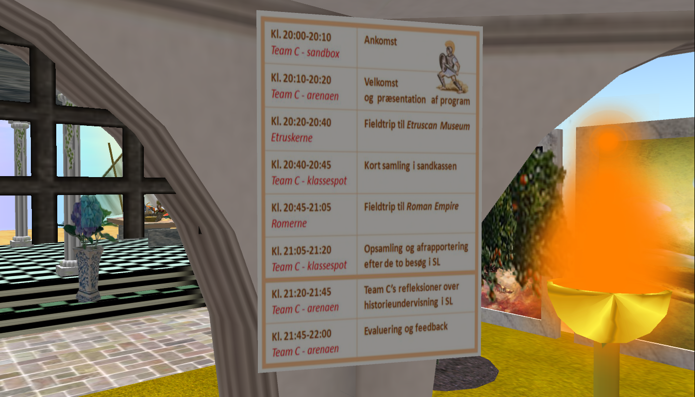 Prior to their presentation, Team C sent out information in SL and in our regular 2D-platform. As part of this material, they sent out an invitation to a “Junior-High” class, which was a very appealing way of setting the scene for their presentation, and  they received a lot of positive comments from their fellow class mates. Team C’s agenda looked like this: