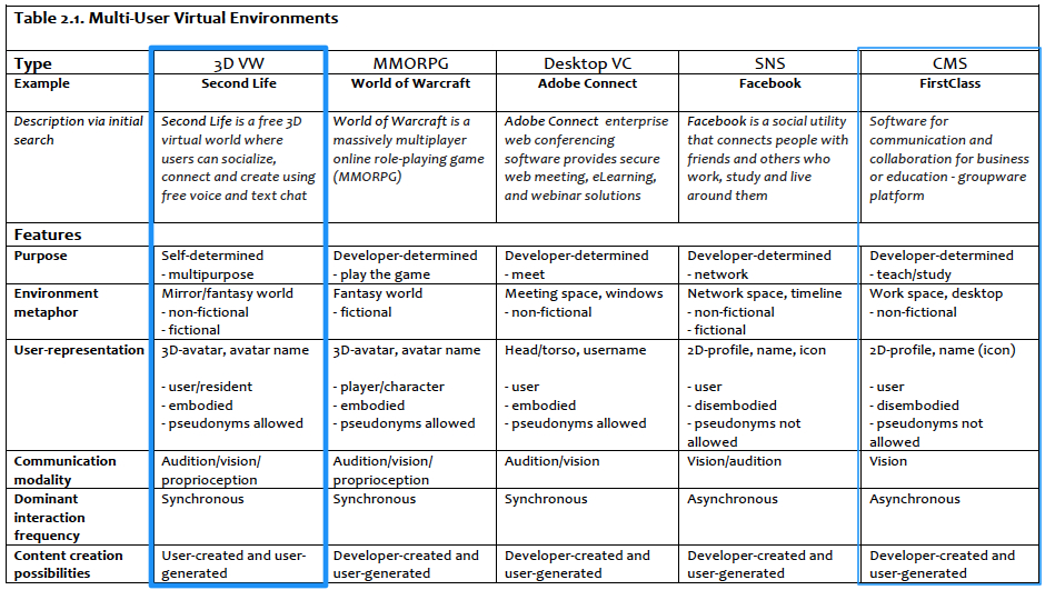It is important to notice that the primary focus of my study is on Second Life. Nonetheless, other types of MUVEs cannot be ignored simply because both the research literature and the participants in my study often refer to these other types in an attempt to make sense of Second Life. In the table below, I’ve provided an overview of the different types of MUVEs that are relevant to have in mind as part of the overall context of my study.