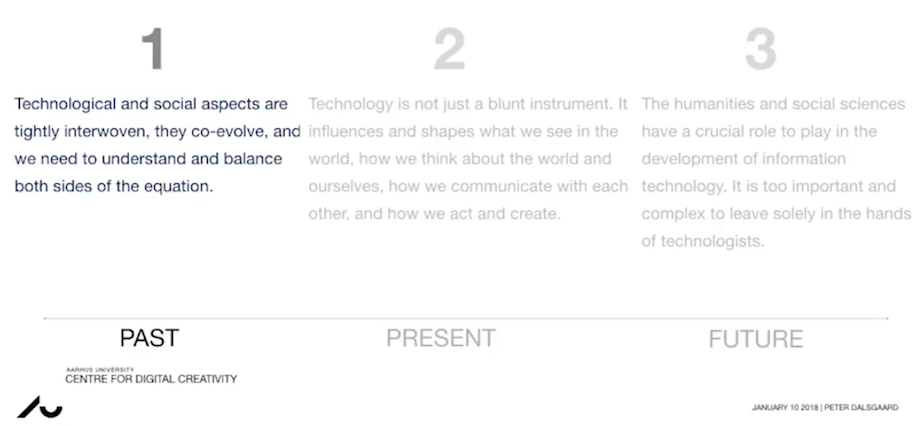 Såvel som de øvrige nævnte forskere, opfordrer Lundtofte til kritisk stillingtagen på et nuanceret og balanceret grundlag. Grundet sagens kompleksitet, trækker medieforskningen ofte på beslægtede forskningsområder, og inden for feltet Human-Computer-Interaction er man også optaget af vores omgang med nye medier og teknologi. I dette oplæg, stiller Peter Dalsgaard (AU) det klassiske, men stadigt centrale spørgsmål ‘Do we shape technology, or does technology shape us?‘, og Dalsgaard har bla. disse pointer, som jeg synes på fin vis opsummerer, hvad der er på spil og hvad, der er behov for: